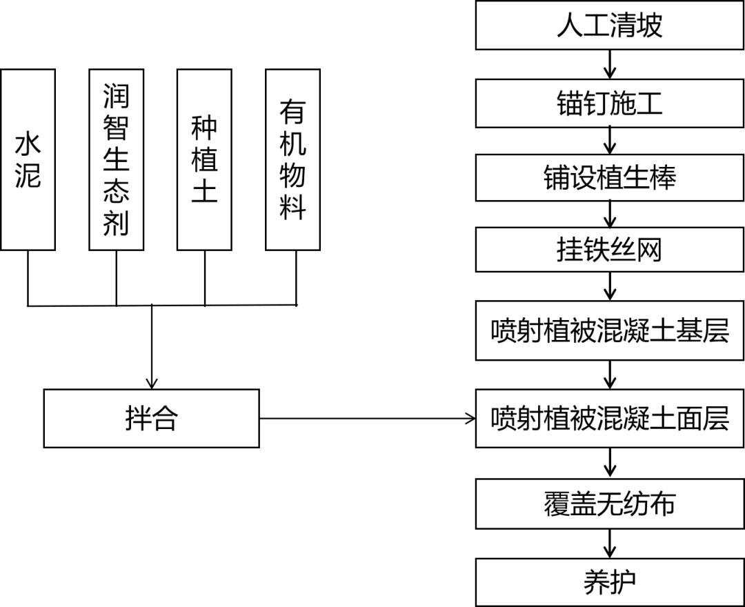 左壩肩邊坡位于左壩壩肩,面積約2200m2,最大高約39m,分三級,坡度40~70°。本邊坡采用植被混凝土生態(tài)恢復(fù)技術(shù);馬道沿外側(cè)砌筑擋土埂形成種植糟,種植槽內(nèi)覆土種植迎春(或薔薇)和爬山虎。